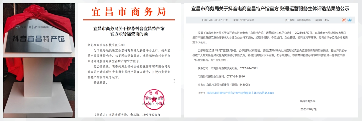 为充分利用电商平台流量优势,推动互联网与宜昌本地特色产业融合,助推宜昌农特产品线上销售,促进宜昌特色产业发展。2023年湖北蜜桃精一区一区三区企业孵化管理有限公司、湖北星上星文化传媒公司、湖北合拍文化传媒有限公司、翠林农业联合运营抖音宜昌特产馆。